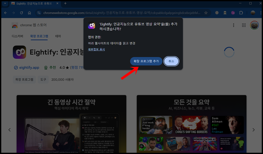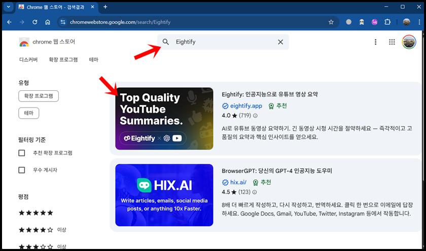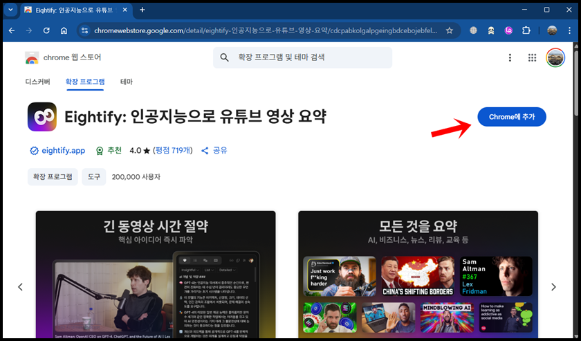 Eightify라고 검색하시면 위 사진과 같이 Eightify:인공지능으로 유튜브 영상 요약 확장프로그램이 보일 텐데 클릭해 주세요.