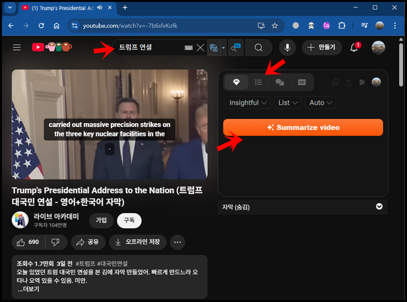 이제 유튜브에서 접속하셔서 아무 영상이나 열어보시면 위 사진처럼 오른쪽 상단, 혹은 하단에 창이 하나 트는데, Summarize Video를 클릭하면 AI가 자동으로 내용을 정리해 줘요.