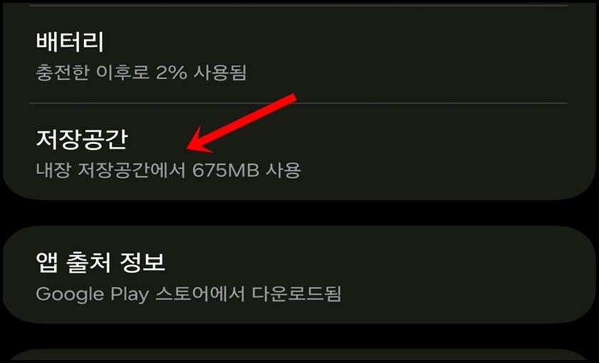 앱 목록 중 원하는 앱을 선택 후 위 사진처럼 "저장 공간"메뉴로 들어가 주세요.