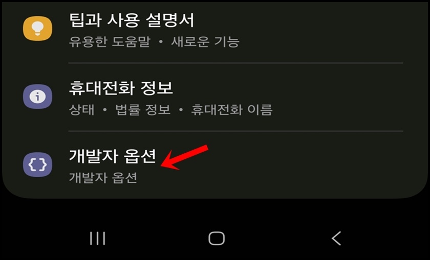 위 사진처럼 휴대전화 정보 메뉴 하단의 "개발자 옵션"메뉴가 활성화된 걸 확인할 수 있어요. "개발자 옵션"메뉴를 클릭해서 들어가 주세요.