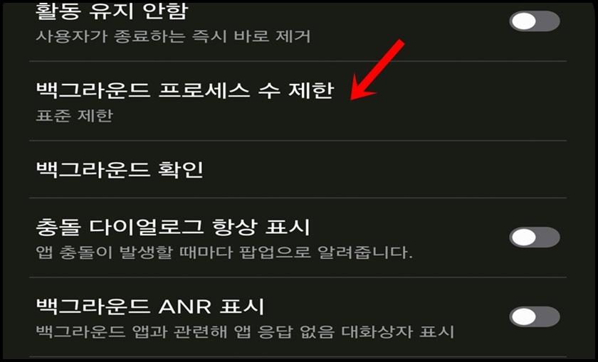 "백그라운드 프로세스 수 제한"을 통해서 앱 잔여 활동을 최소화할 수 있어요. 생각보다 간단하죠?