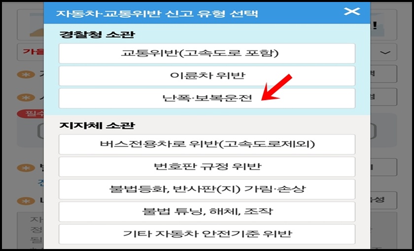 신고 유형을 상황에 맞게 선택을 해주세요. 저의 경우는 "난폭 및 보복운전"이기에 선택을 해주었습니다.