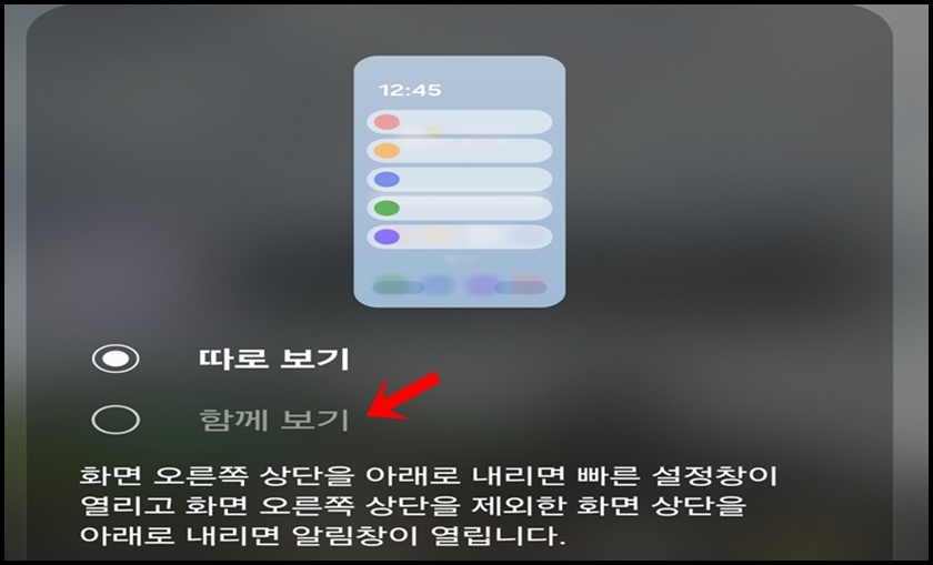 위 사진을 보시면 "따로 보기" or "함께 보기" 설정을 할 수 있어요. 따로 보기는 화면 오른쪽 상단을 내리면 빠른 설정창이 열리고 화면 오른쪽 상단을 제외한 화면 상단을 아래로 내리면 알림 창이 열리게돼요. "함게 보기"를 선택하시게 되면 빠른 설정창과 알림창이 하나의 창으로 변경이 되요. "함께 보기"로 선택을 해주세요.