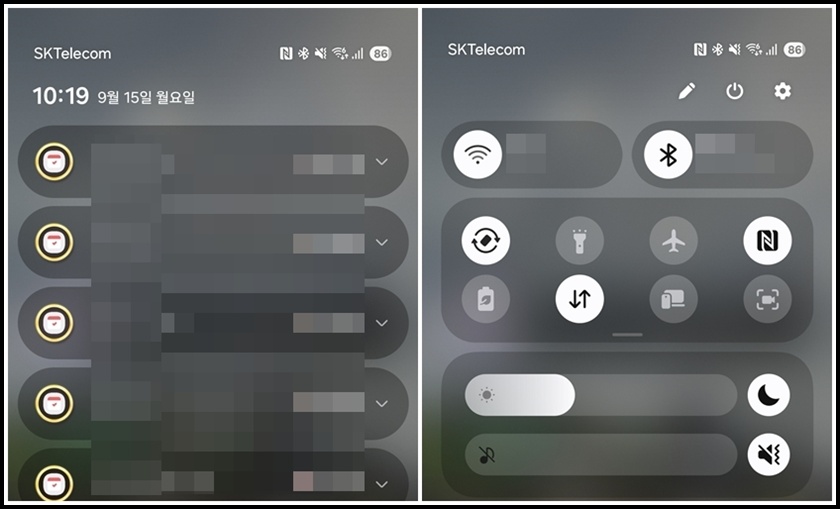 위 사진을 보시면 갤럭시 스마트폰의 왼쪽 상단바를 내리면 알림창이 오른쪽 상단바를 내리면 설정창이 내려와 불편하셨을 거예요. 이 상단을 내렸을 때 해당 부분을 합쳐보도록 해볼게요.