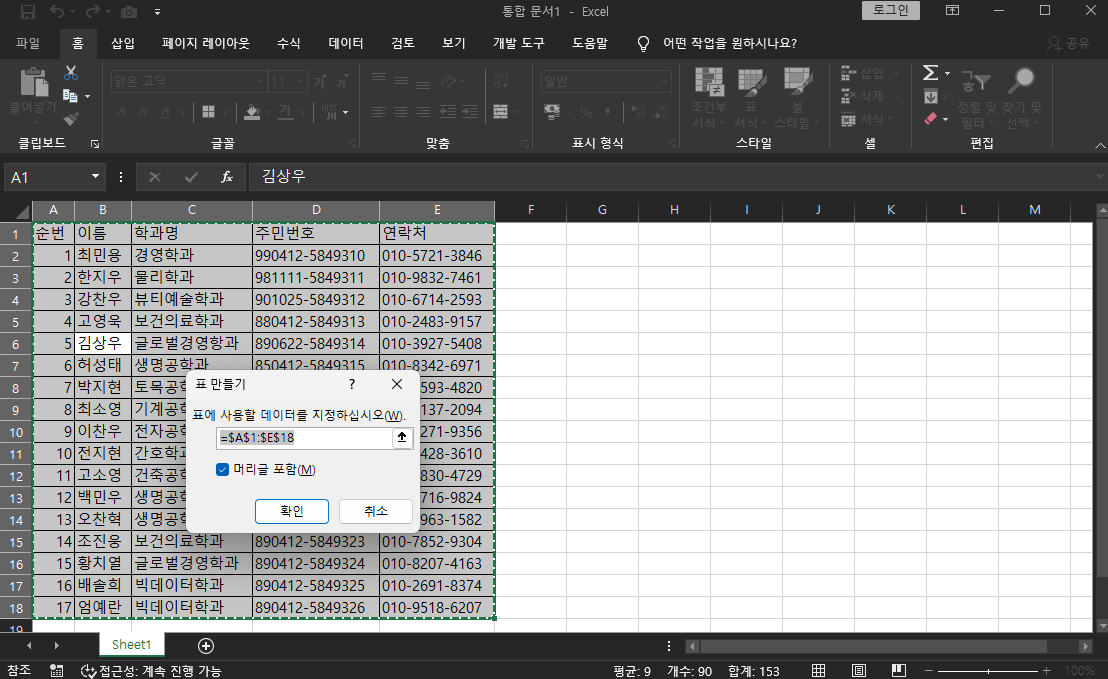 마지막으로 Ctrl + T를 눌러주세요. 이 기능은 표로 변환(Create Table) 단축키로 선택한 데이터 범위를 엑셀 표(Table)로 변환해 주는 거예요.