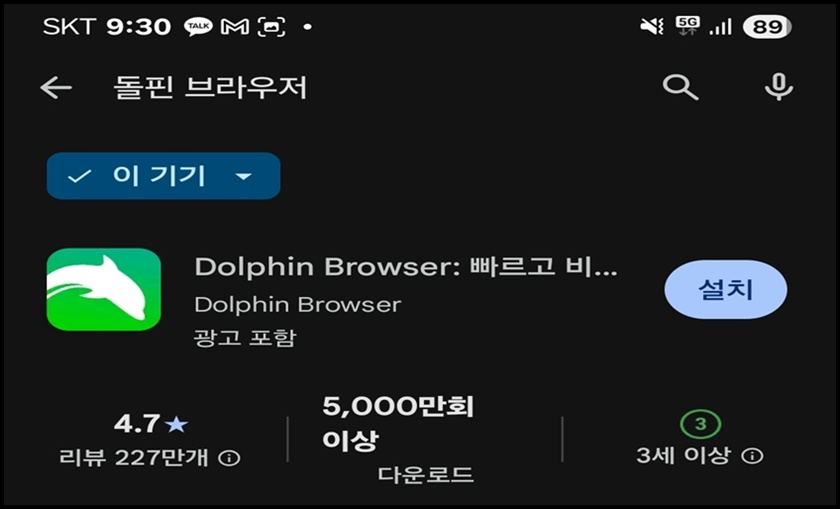 먼저 갤럭시 스마트폰에서 "돌핀 브라우저(Dolphin Browser)를 설치해주셔야되요. 돌핀 브라우저는 안드로이드와 iOS에서 사용할 수 있는 모바일 웹브라우저로, 일반 크롬, 사파리 브라우저와 비슷해요. 갤럭시에서 배트맨 토토 같은 사이트를 결제하기 위해선 돌핀 브라우저가 필수예요. 구글 스토어에서 돌핀 브라우저를 검색 후 설치를 진행해 주세요.