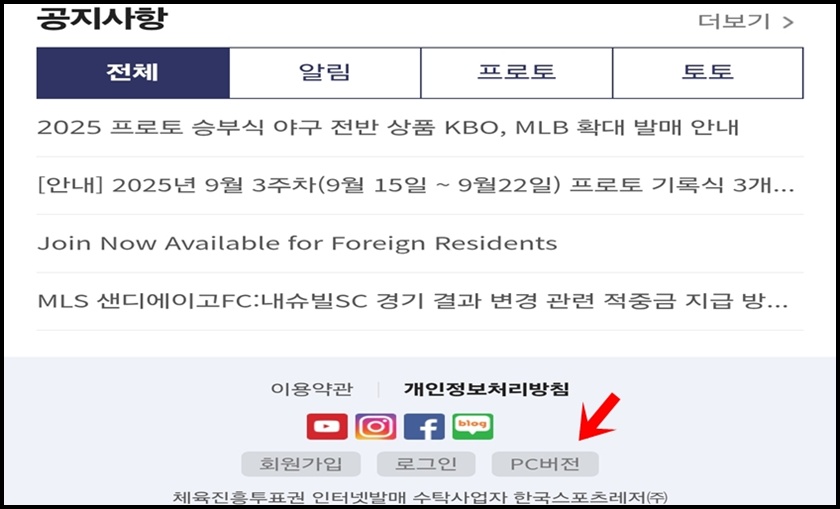 자 이제 페이지 하단의 "PC버전"버튼을 클릭해 주세요.