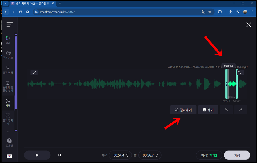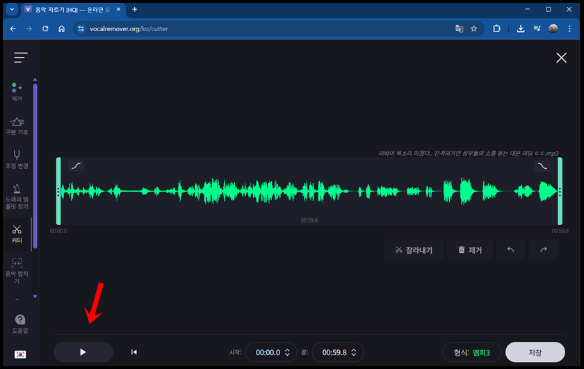 잘라내기 후에 플레이를 해보고 특이사항이 없다면 "저장"을 해주시면 돼요. 아주 간단하게 음원에서 특정 목소리나 구간을 잘라낼수 있어요.
