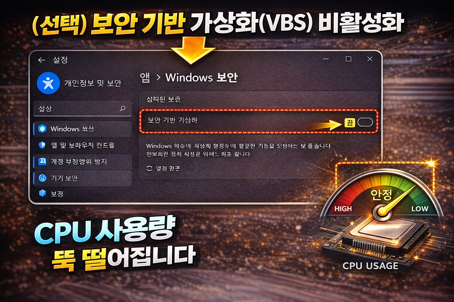 VBS는 보안을 강화하는 기능이지만 일부 PC에서는 성능 저하의 원인이 될 수 있습니다. 회사 PC 또는 보안 정책이 있는 환경에서는 권장하지 않습니다.