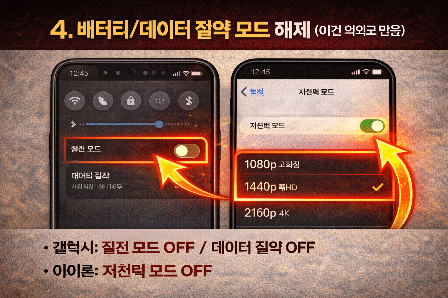 - 안드로이드: 설정 → 배터리 → 절전 모드 OFF / 데이터 절약 OFF