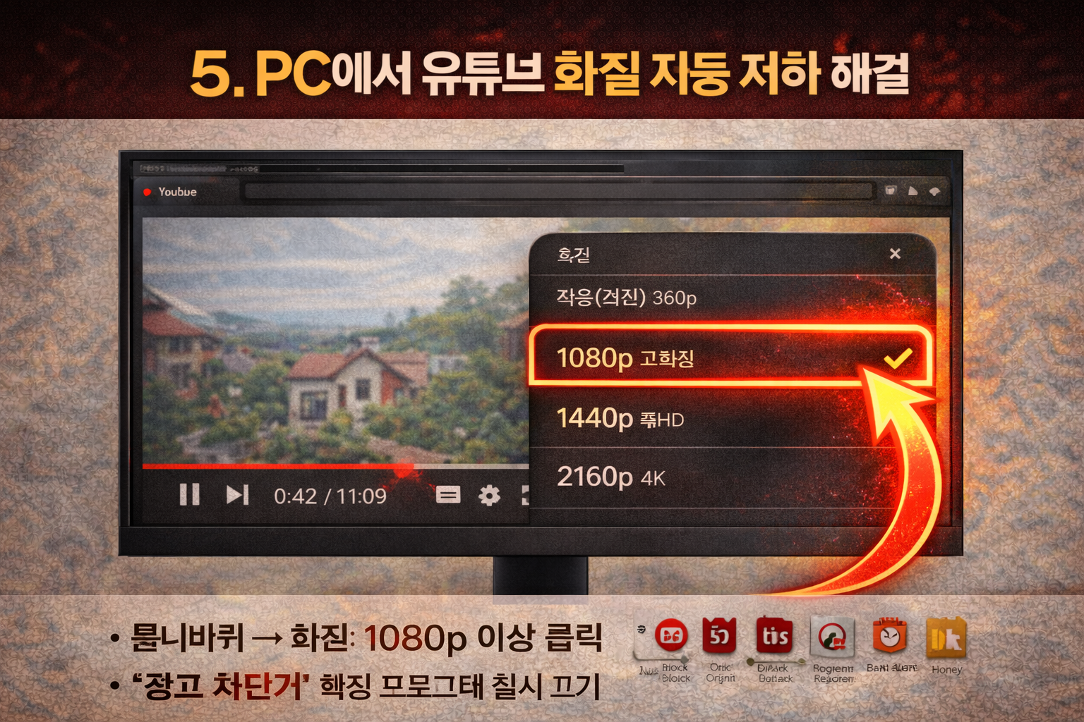 일부 광고 차단기/최적화 확장 프로그램이 재생을 불안정하게 만들어 화질이 내려가는 경우가 있습니다.