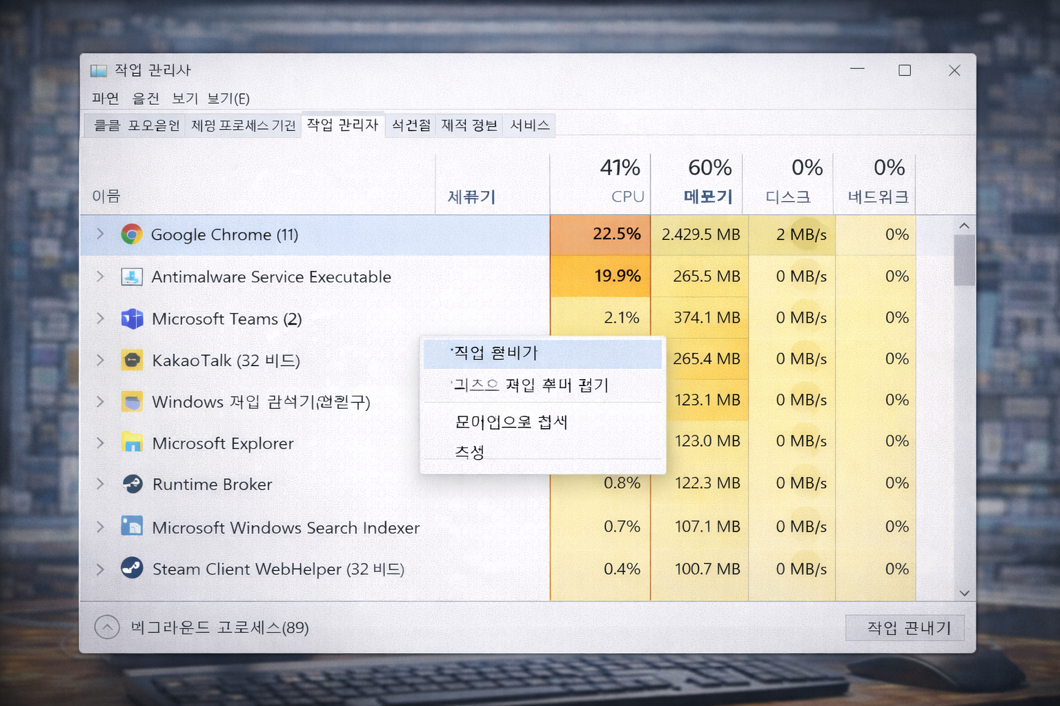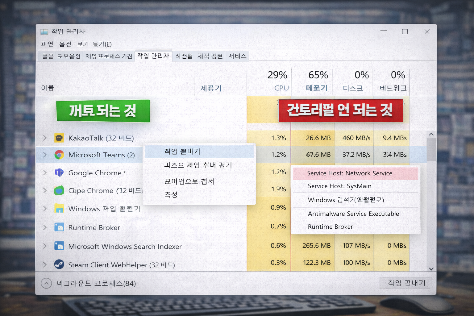 이런 걸 무작정 종료하면 화면이 순간 멈춘 것처럼 보이거나, 시스템이 불안정해질 수 있습니다.