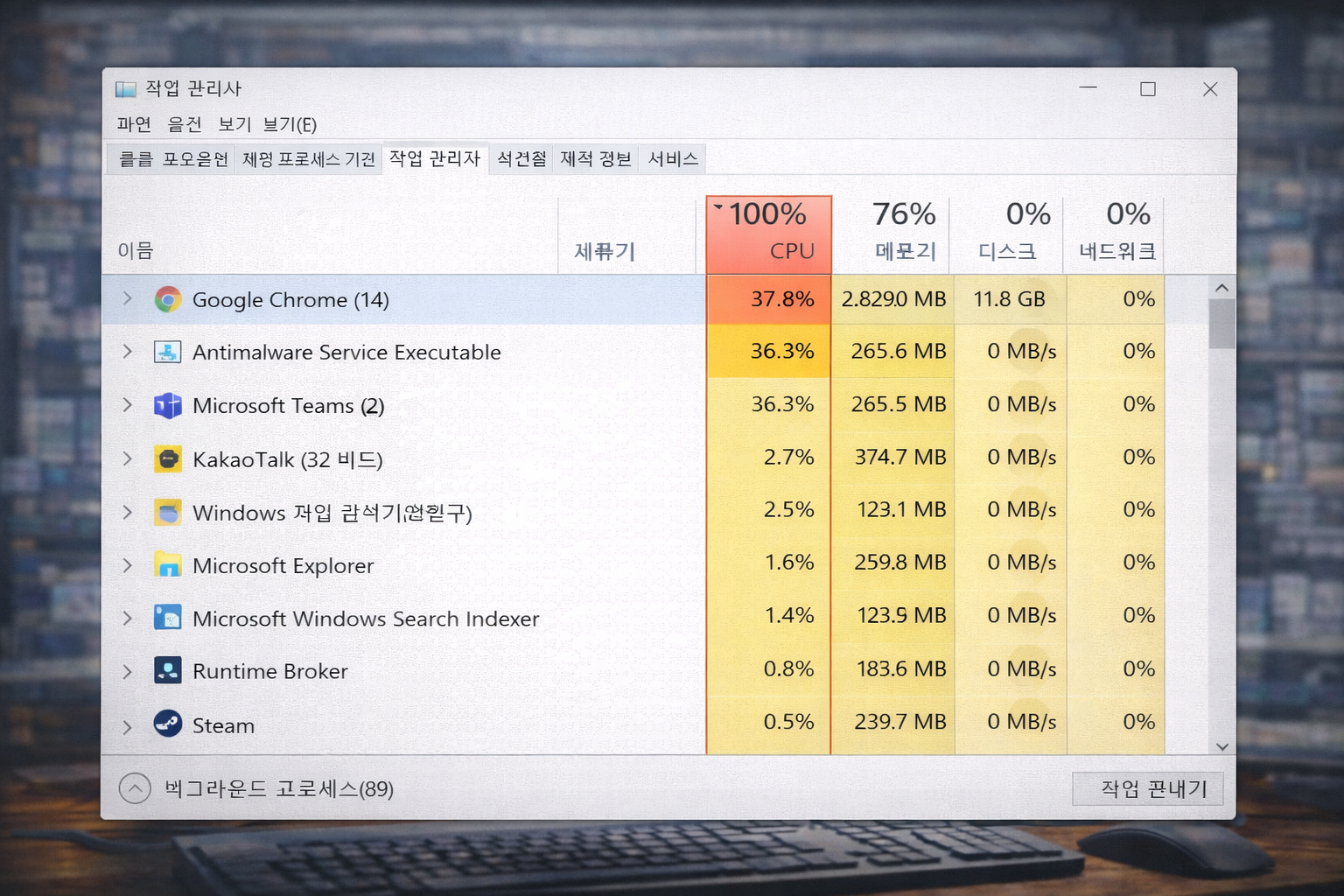 작업 관리자에서 가장 먼저 보는 건 보통 CPU/메모리 사용률입니다. 특히 CPU가 80~100%면 누구나 불안해지죠.