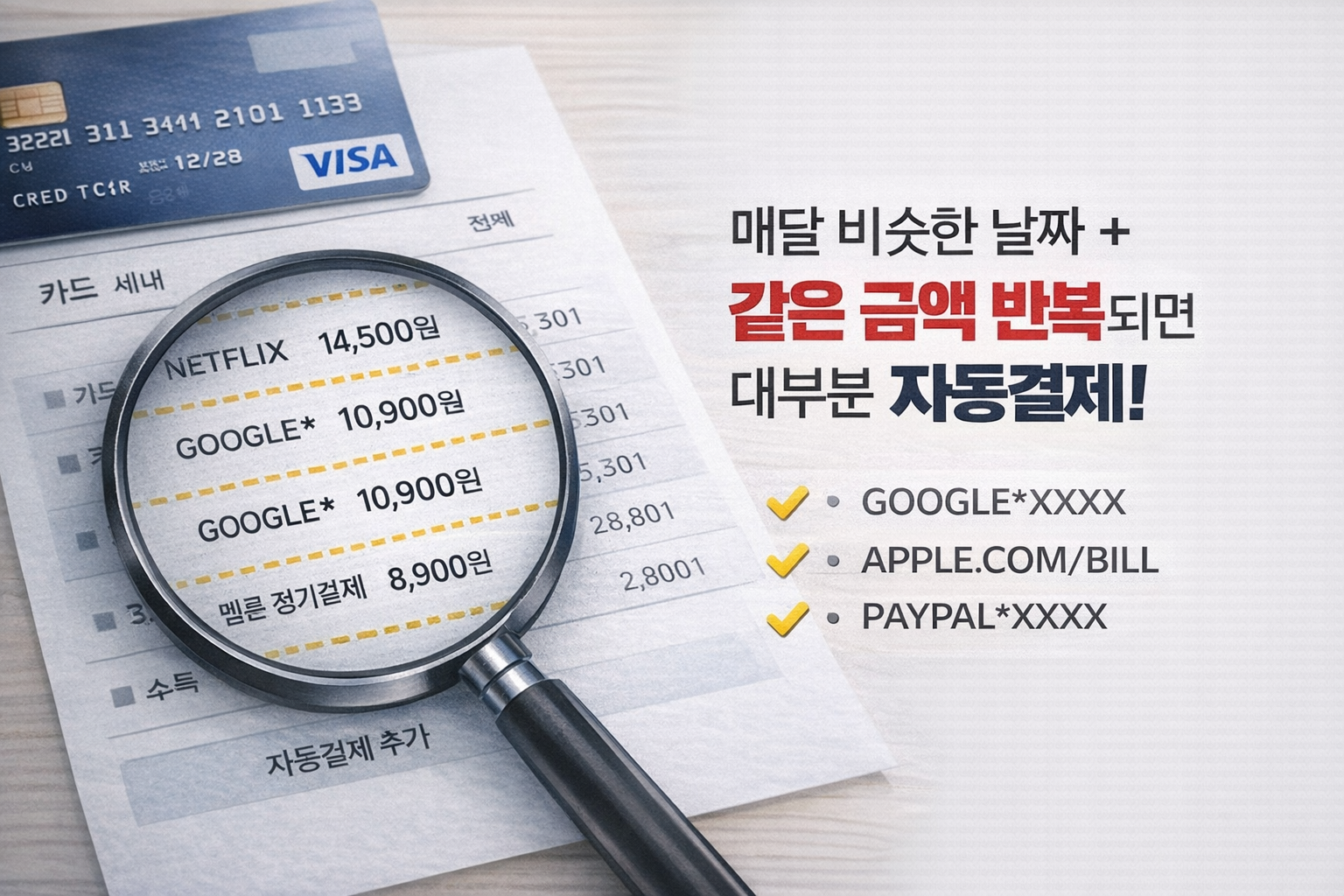최근 3~6개월 카드 명세서 열기 → 금액·가맹점명이 반복되는 항목 체크 → 결제 대행사 표기(예: GOOGLE*, APPLE.COM/BILL, PAYPAL*)도 주의