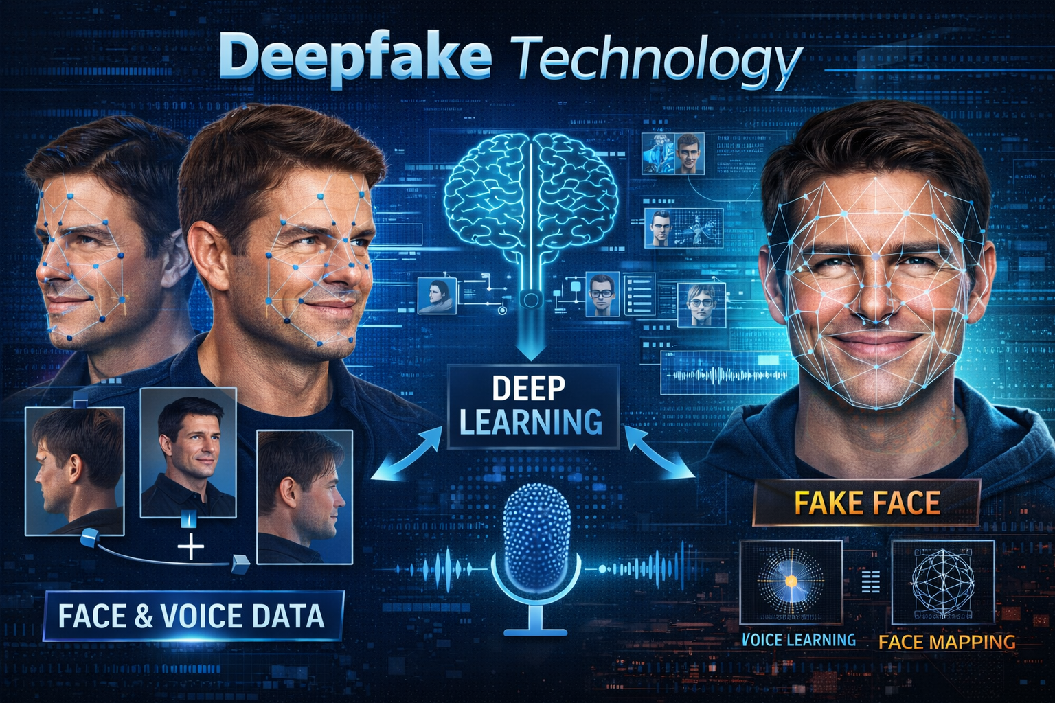 딥페이크(Deepfake)는 딥러닝(Deep Learning) 기반의 합성 기술로, 실제 존재하는 사람의 얼굴·표정·말투·목소리를 학습한 뒤 다른 영상/음성에 자연스럽게 덮어씌우는 것을 말합니다.