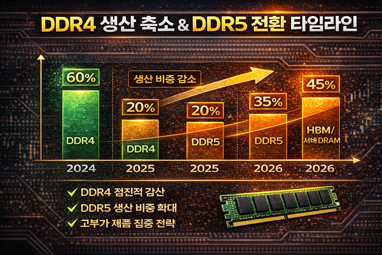 현재 DDR4는 기술적으로 성숙 단계에 진입한 규격이며, 메모리 제조사들은 점진적으로 생산 비중을 DDR5 및 고부가 제품(HBM, 서버 DRAM)으로 이동시키고 있습니다. 이는 기술 진화라기보다는 수익성 중심의 전략적 판단으로 해석됩니다.