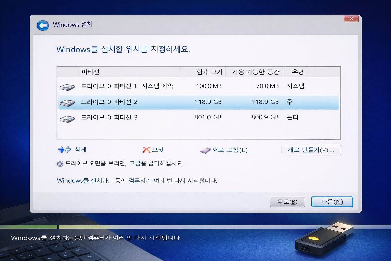 윈도우 재설치는 보통 USB 설치 미디어로 부팅해서 윈도우를 “다시 까는” 방식입니다. 여기서 중요한 포인트는 파티션을 어떻게 처리하느냐인데요.