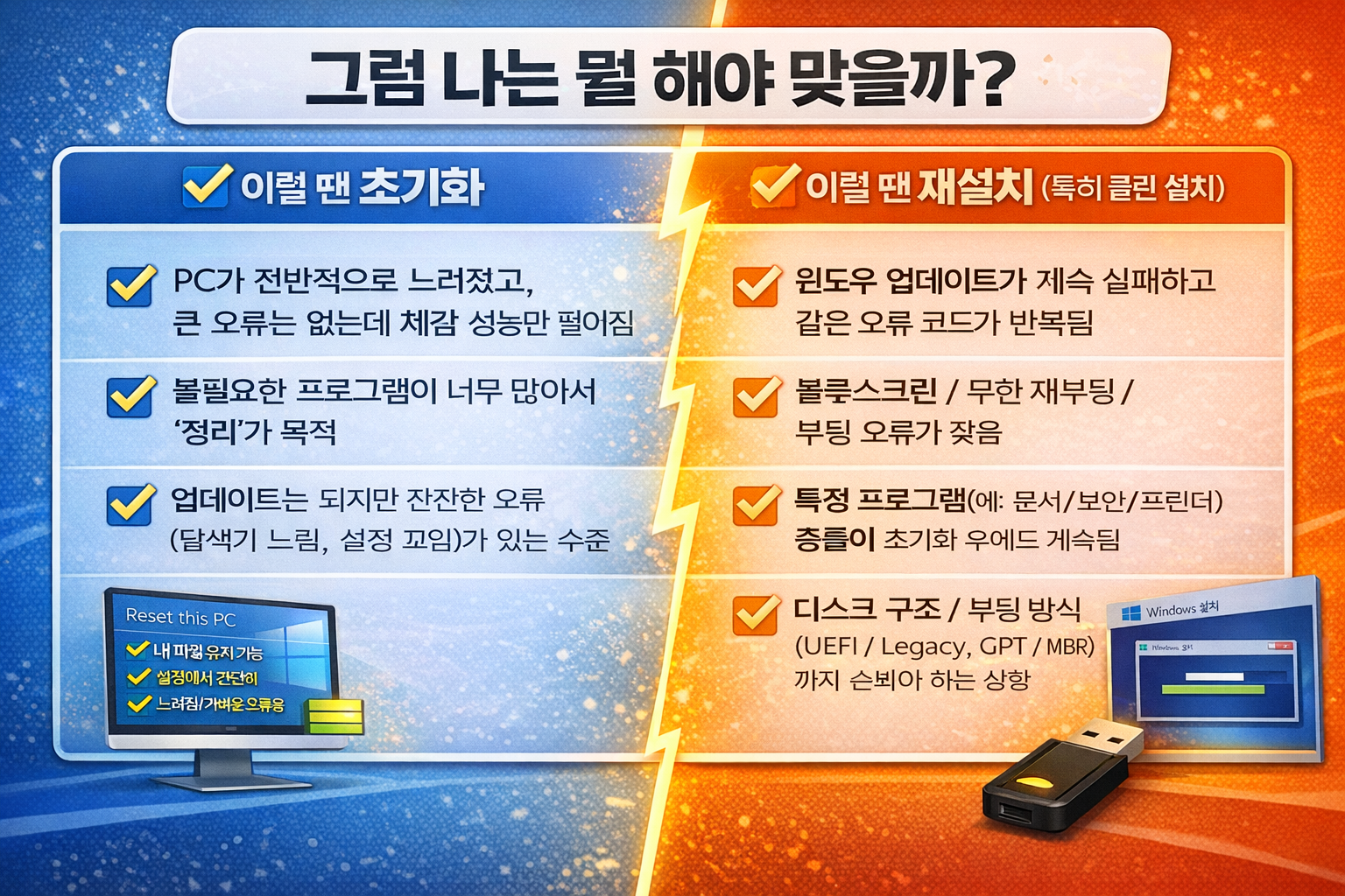 | 추천 상황 | 느려짐/가벼운 오류/정리 목적 | 업데이트 실패 반복/블루스크린/드라이버 꼬임/문제 지속 |