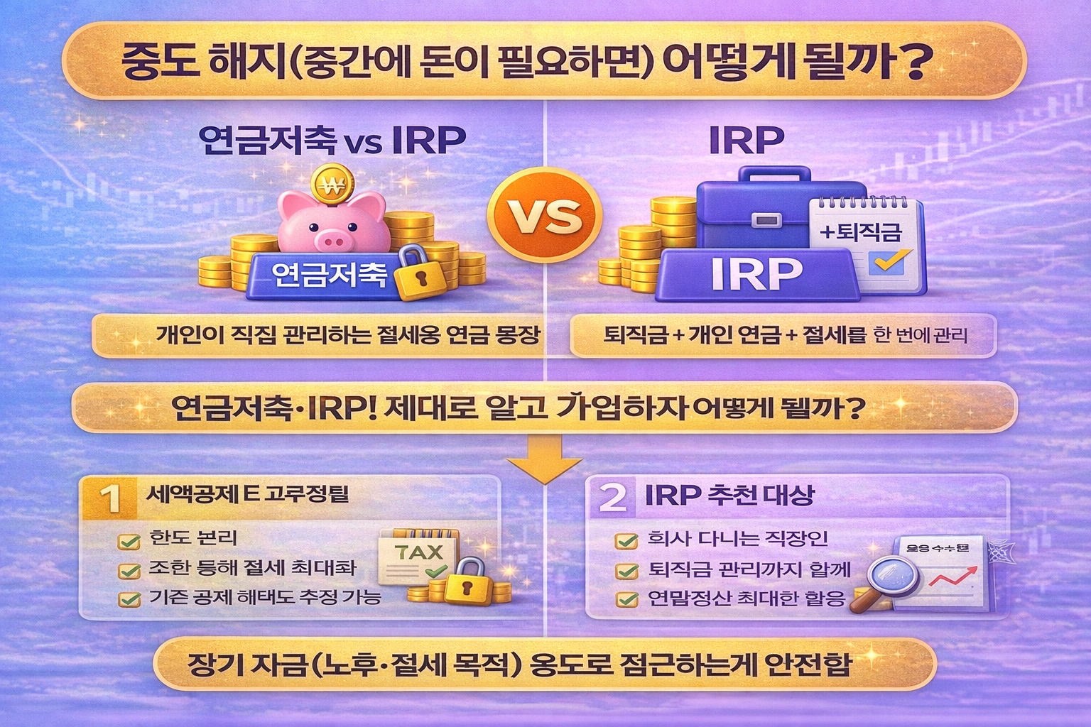 그래서 이 두 상품은 “당장 쓸 돈”이 아니라, 장기 자금(노후/절세 목적)으로 접근하는 게 안전합니다.