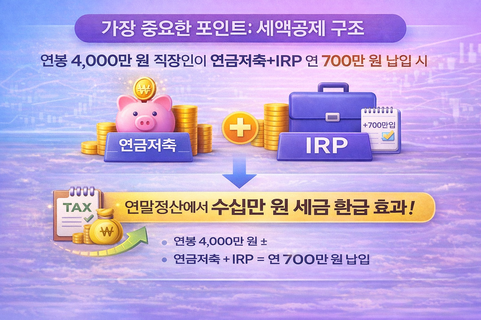 “세액공제 된다”라는 말만 보면 감이 잘 안 옵니다. 그래서 간단한 예시로 보겠습니다. 예를 들어 연봉 4,000만 원 직장인이 연금저축+IRP에 연 700만 원을 납입하면, 연말정산에서 수십만 원 수준의 세금 환급 효과가 생길 수 있습니다.