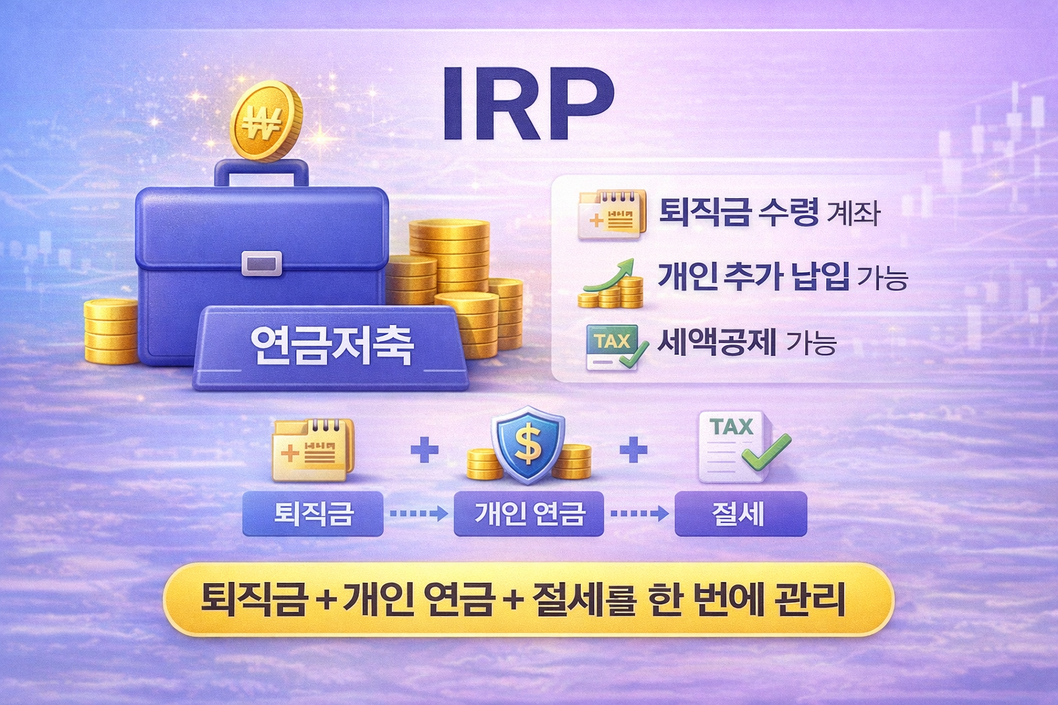 IRP는 개인형 퇴직연금 계좌입니다. 원래는 퇴직금을 받기 위한 용도지만, 요즘은 많은 직장인들이 개인 추가 납입을 통해 연말정산 절세용으로 활용합니다. 정리하면 IRP는 “퇴직금 + 개인 연금 + 절세”를 한 번에 관리하는 계좌라고 보면 됩니다.