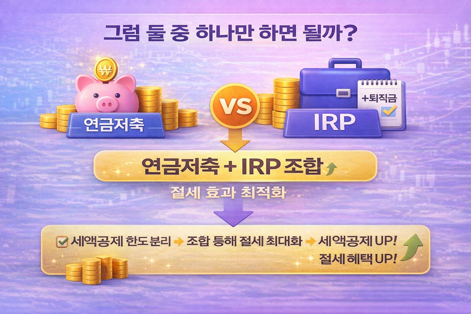 결론부터 말하면 아닙니다. 실제로 많은 직장인들이 연금저축 + IRP를 함께 활용합니다. 이유는 간단해요. 세액공제 한도가 분리되어 있고, 두 상품을 조합하면 절세 효과가 더 커지기 때문입니다. 그래서 “둘 중 하나 선택”이 아니라 “어떻게 조합하느냐”가 핵심이 됩니다.