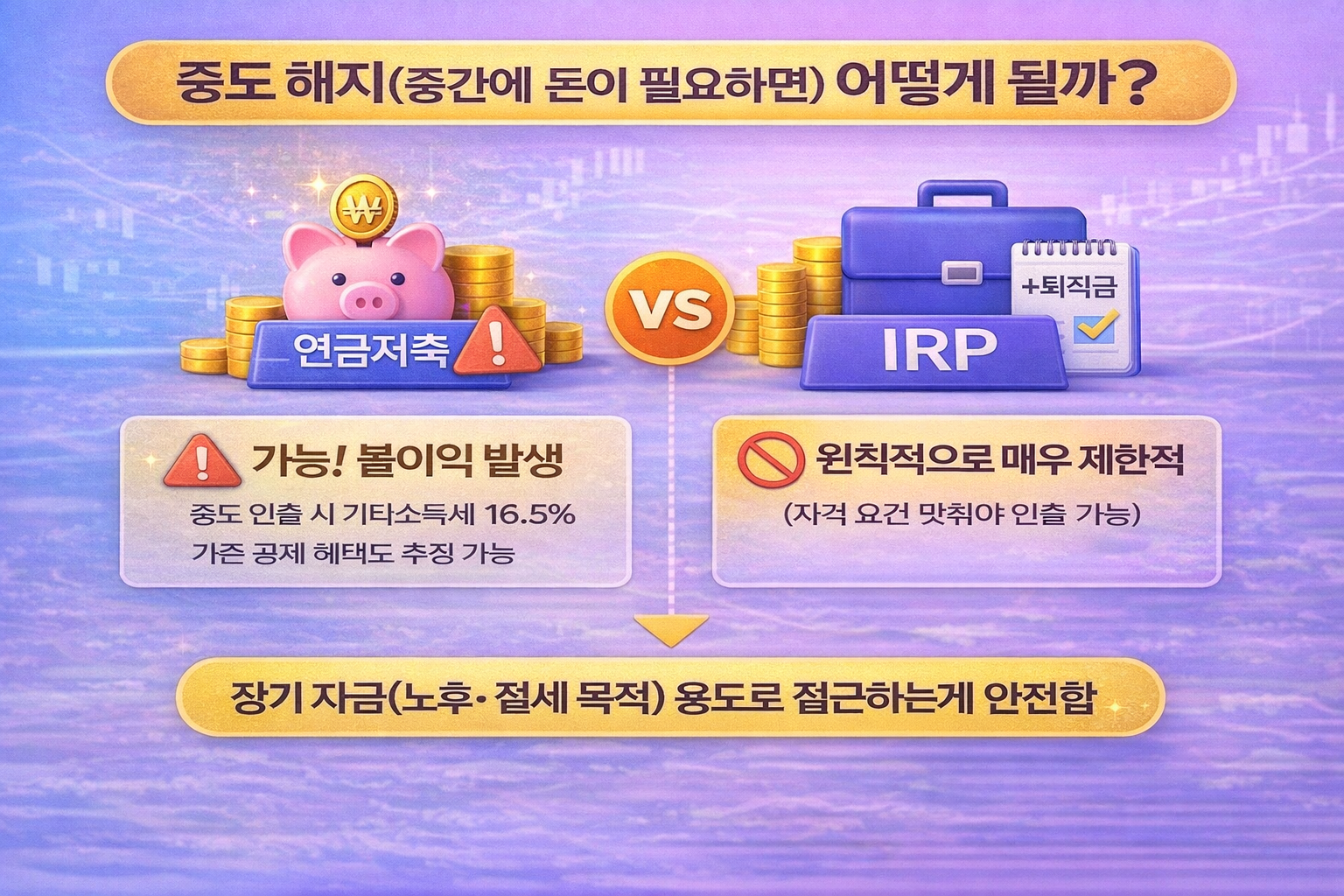 - 중도 인출 : 연금저축(가능하지만 불이익) / IRP(원칙적으로 매우 제한)