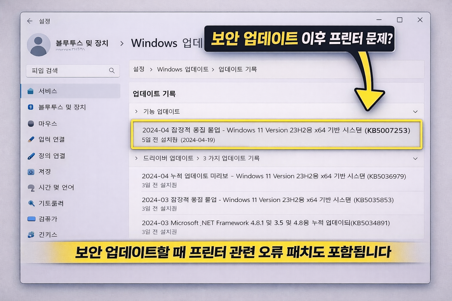 윈도우 보안 업데이트에는 인쇄 관련 보안 패치가 포함되는 경우가 있습니다. 그 과정에서 구형 드라이버/오래된 프린터가 업데이트 직후 갑자기 말썽을 부리기도 해요.