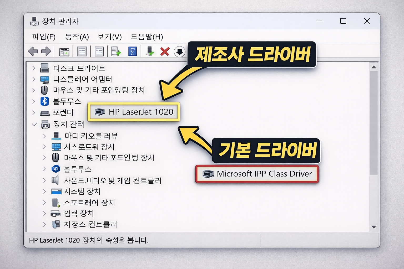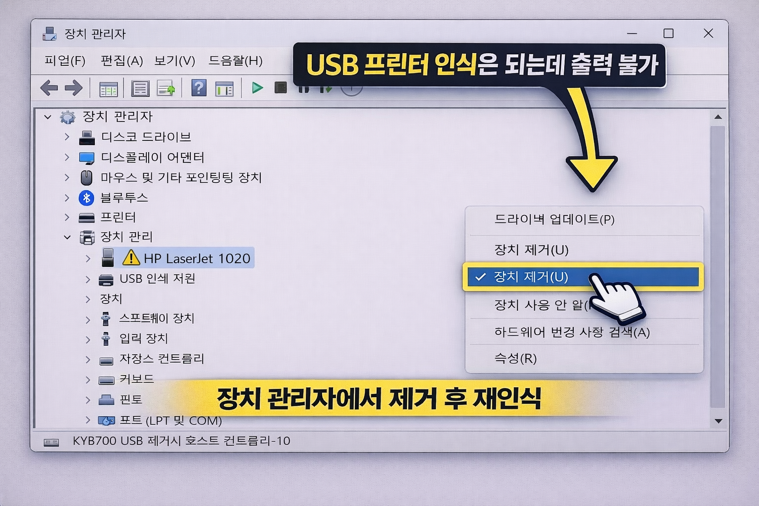 USB 프린터는 업데이트 후 드라이버 캐시가 꼬이거나 장치 인식이 애매하게 남아 “인식은 되는데 출력은 안 되는” 상태가 발생할 수 있습니다.
