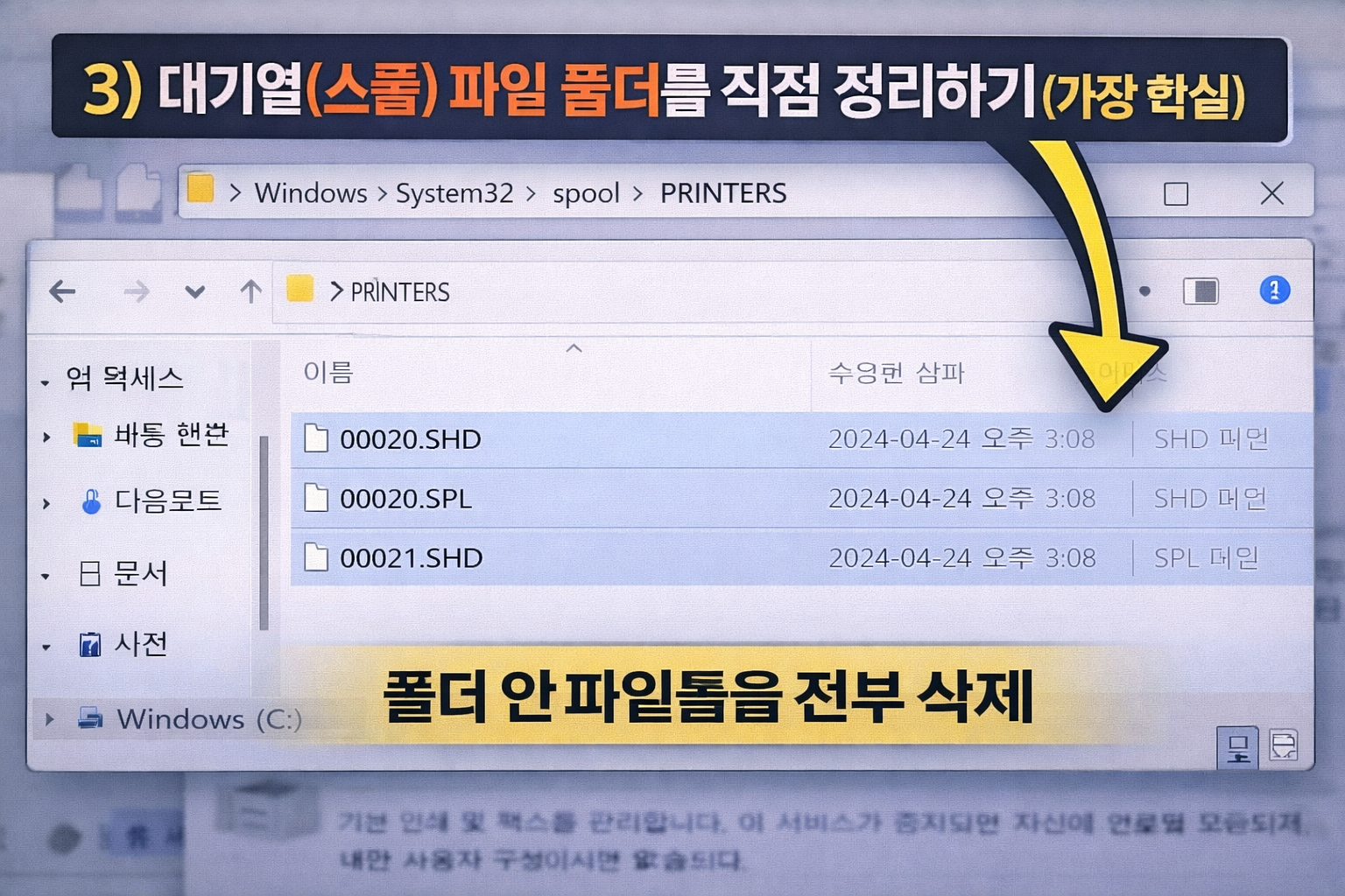 3) 대기열(스풀) 파일 폴더를 직접 정리하기 (가장 확실)