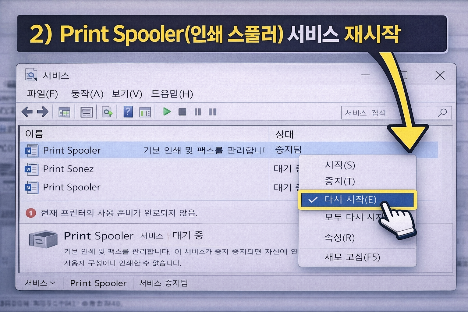 2) Print Spooler(인쇄 스풀러) 서비스 재시작