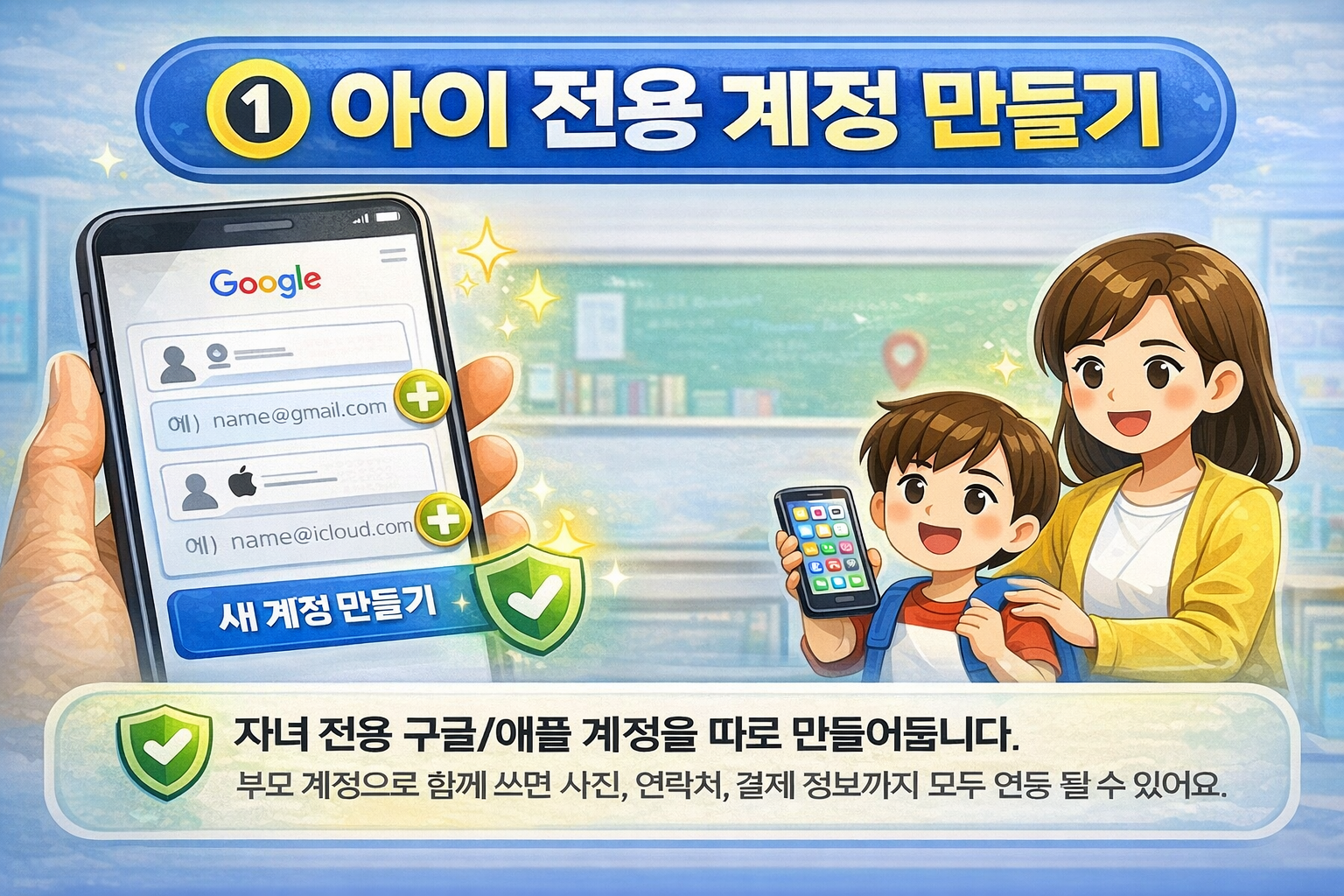 부모 계정을 그대로 사용하게 되면 사진, 연락처, 결제 정보까지 함께 연동되어 나중에 관리가 어려워질 수 있습니다.