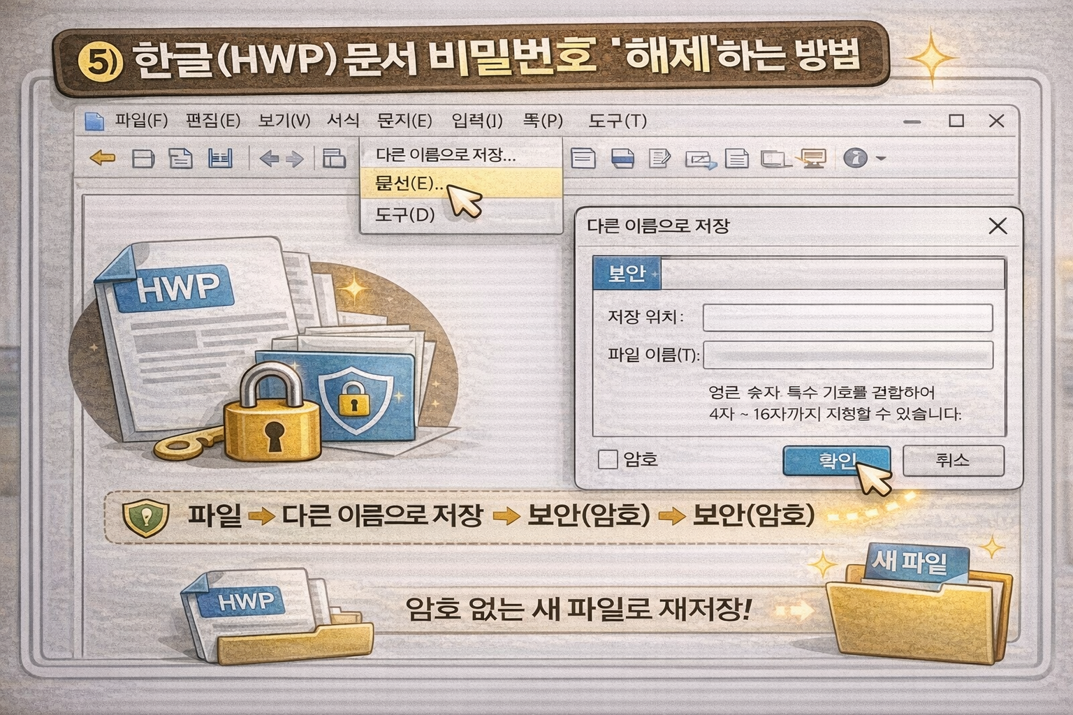 5) 한글(HWP) 문서 비밀번호 “해제”하는 방법 (비번을 알고 있을 때)