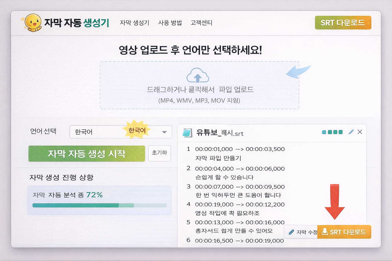 파일 업로드 → 언어 선택 → 자동 분석 → SRT 다운로드 방식으로 초보자도 쉽게 사용할 수 있습니다.