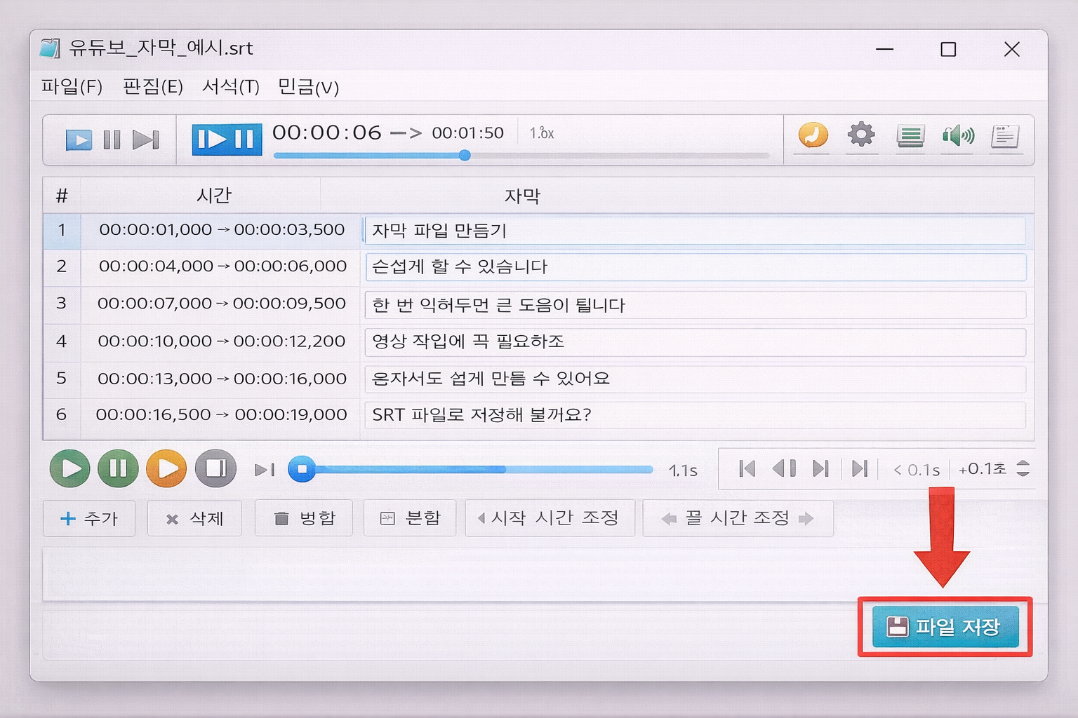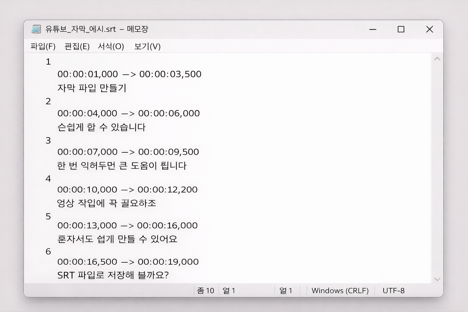 시간 + 대사 + 번호로 구성되어 있어서 대부분의 영상 편집 프로그램과 유튜브에서 바로 인식됩니다.