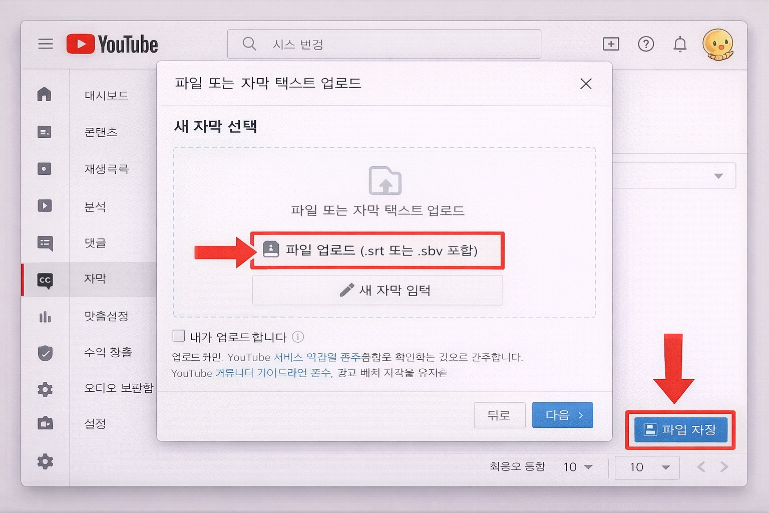 완성된 SRT 파일은 유튜브 관리자 화면에서 바로 등록할 수 있습니다.