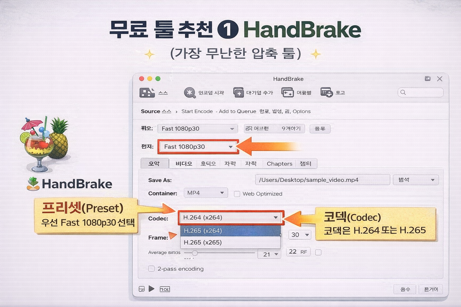 핵심은 코덱은 H.264 또는 H.265로 선택하고, 프리셋(기본 설정)은 “Fast 1080p30” 같은 안정적인 옵션부터 시작하시면 실패 확률이 낮습니다.