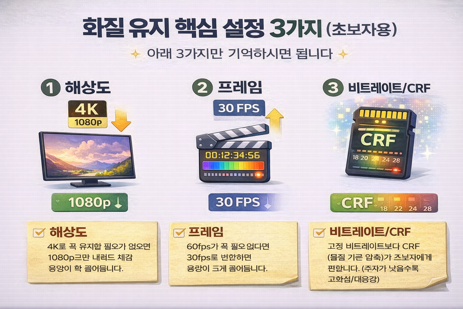 화질을 지키면서 용량을 줄이려면 아래 3가지만 기억하시면 됩니다.