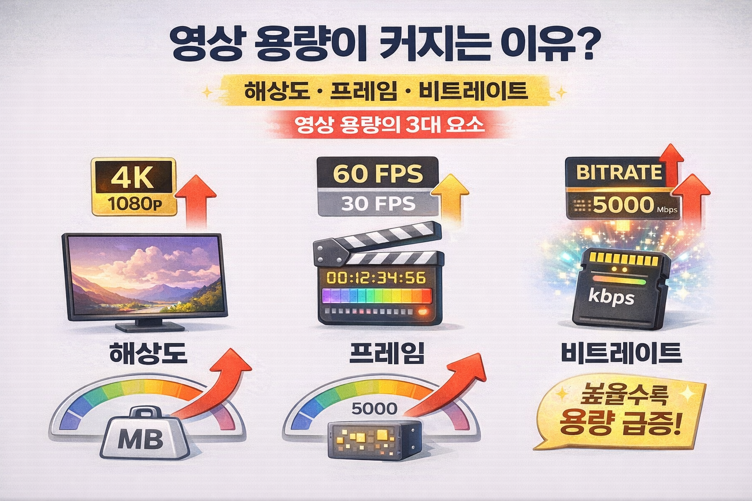 영상 용량은 보통 해상도(1080p/4K), 프레임(30/60fps), 비트레이트(화질 데이터 양) 때문에 커집니다.