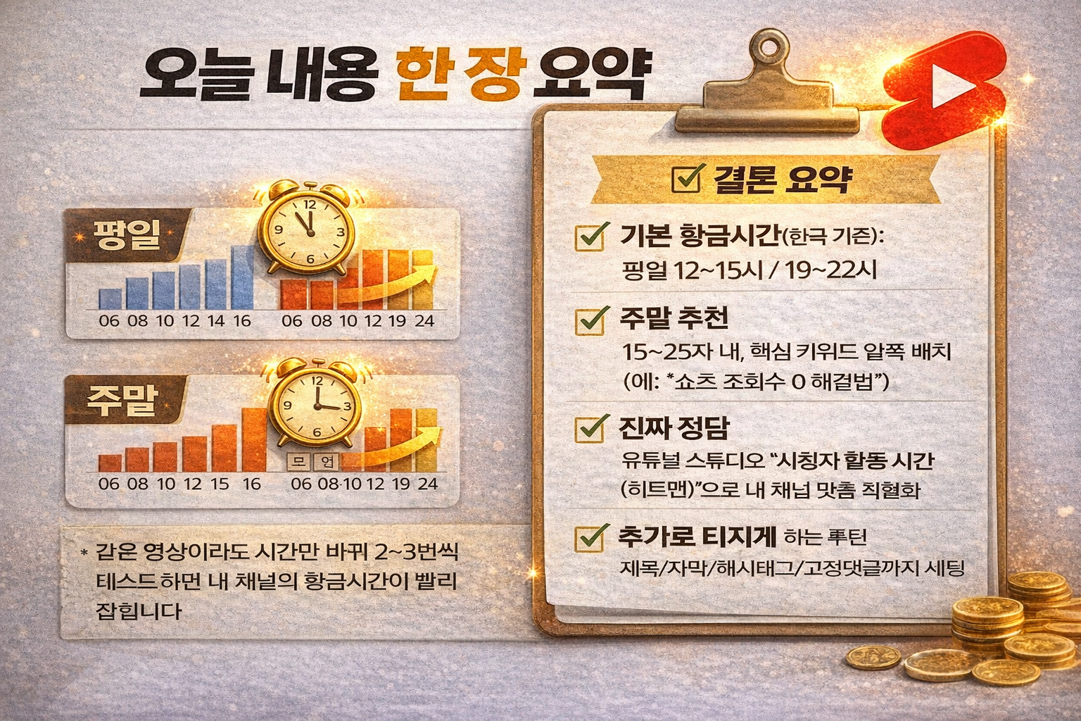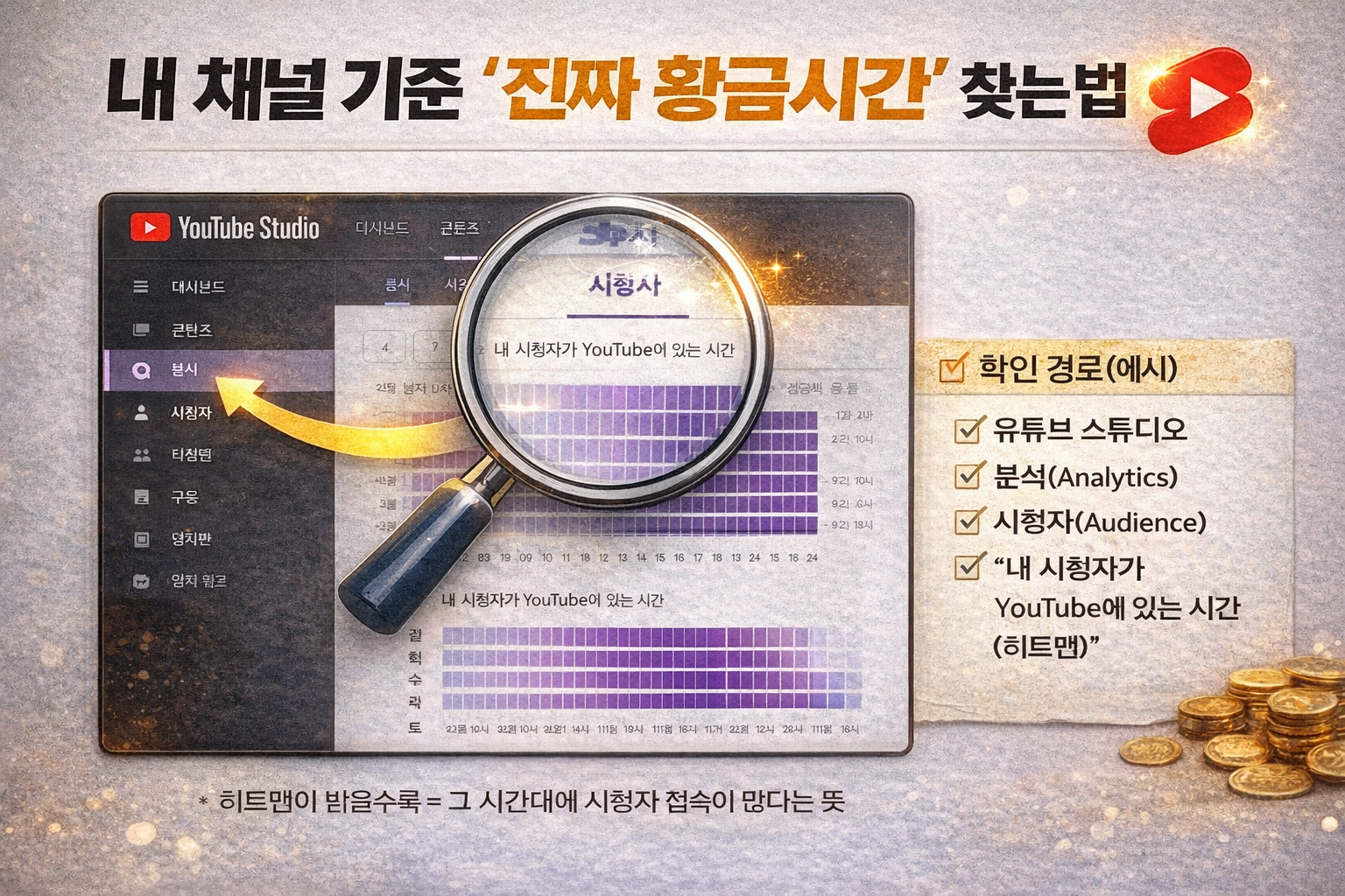 오늘은 한국(KST) 기준으로 많이들 성과가 좋다고 알려진 ‘황금 시간대’를 먼저 정리하고, 마지막에는 내 채널 기준으로 진짜 황금시간을 찾는 방법까지 (초보도 따라할 수 있게) 딱 루틴으로 알려드릴게요.