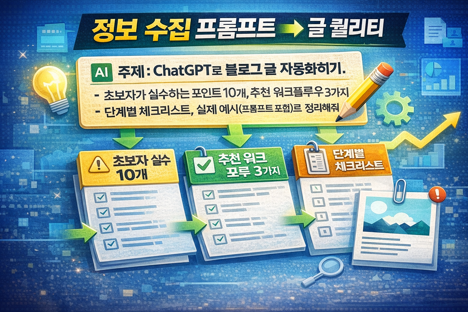 바로 “글 작성”부터 들어가면 내용이 얇아질 때가 있어요. 이럴 땐 먼저 정보 수집 단계를 ChatGPT로 한 번 돌리고, 그 결과로 글을 쓰면 퀄리티가 확 올라갑니다.