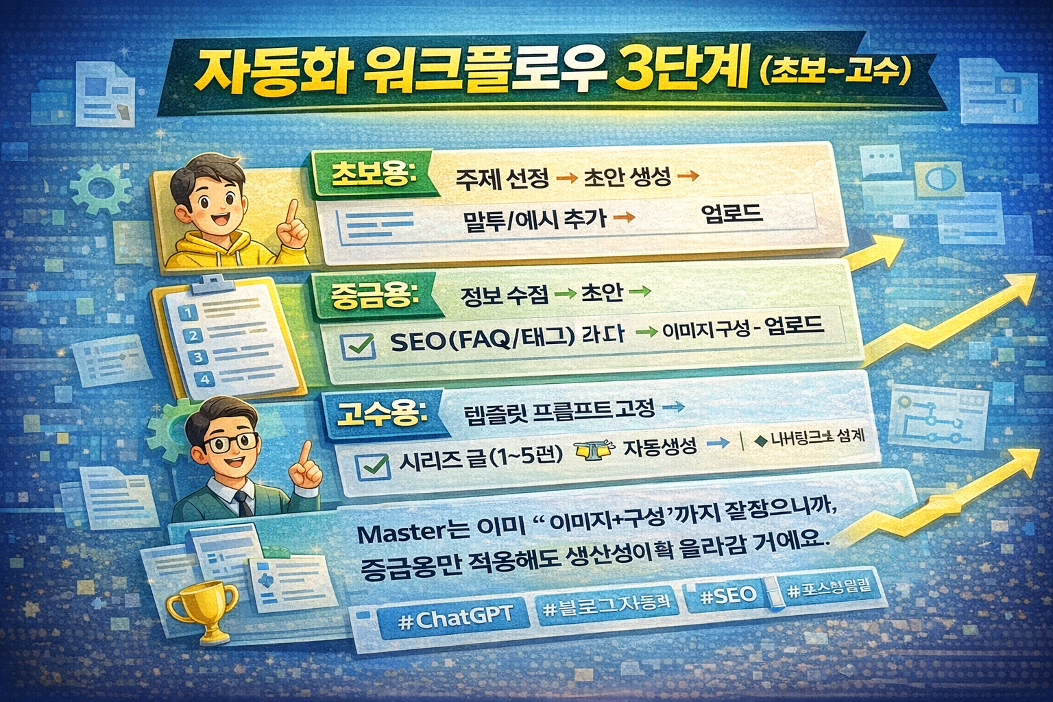 - 중급용: 정보 수집 → 초안 → SEO(FAQ/태그) → 이미지 구성 → 업로드