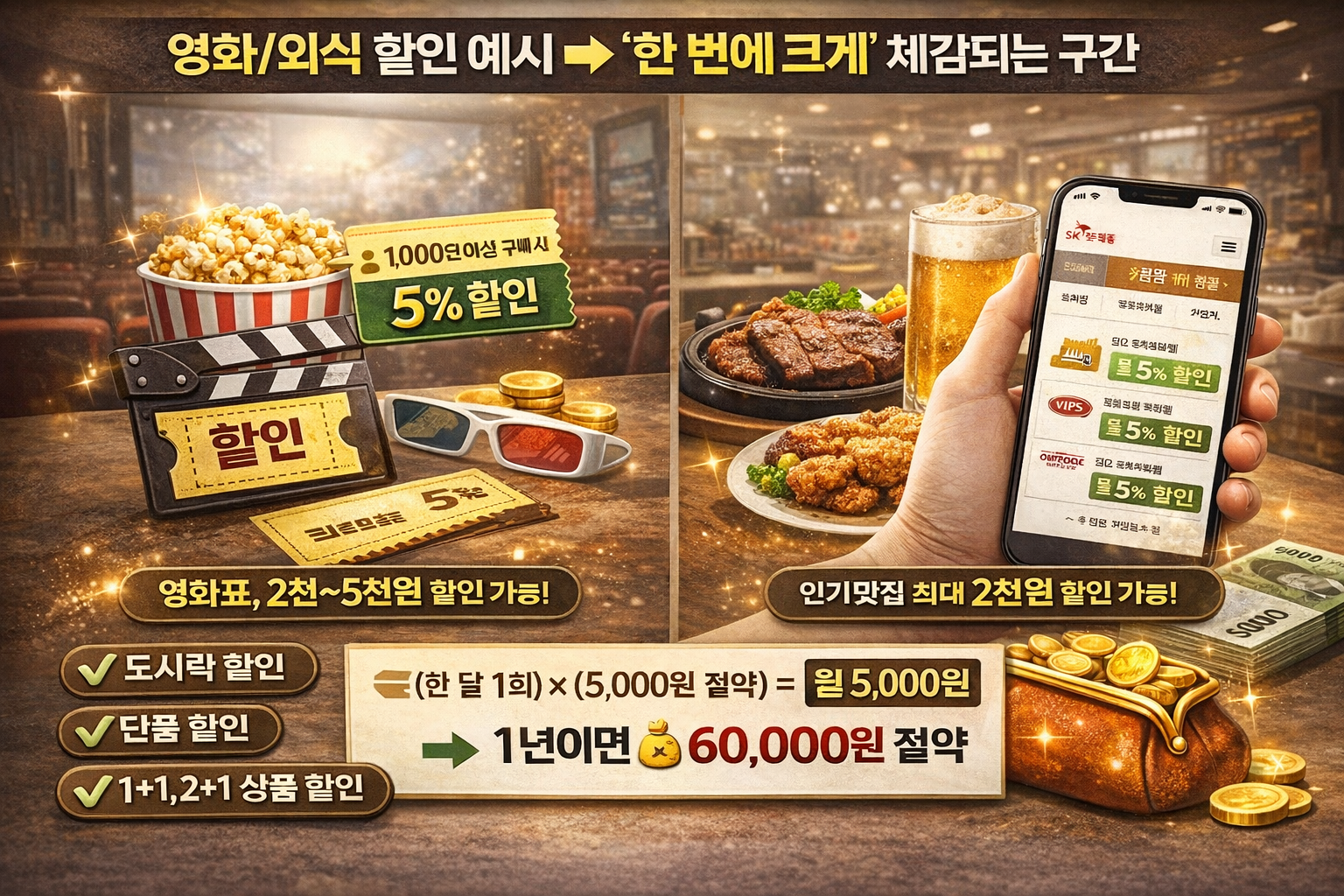 - 영화: 할인 폭이 큰 경우가 많아 체감이 큼