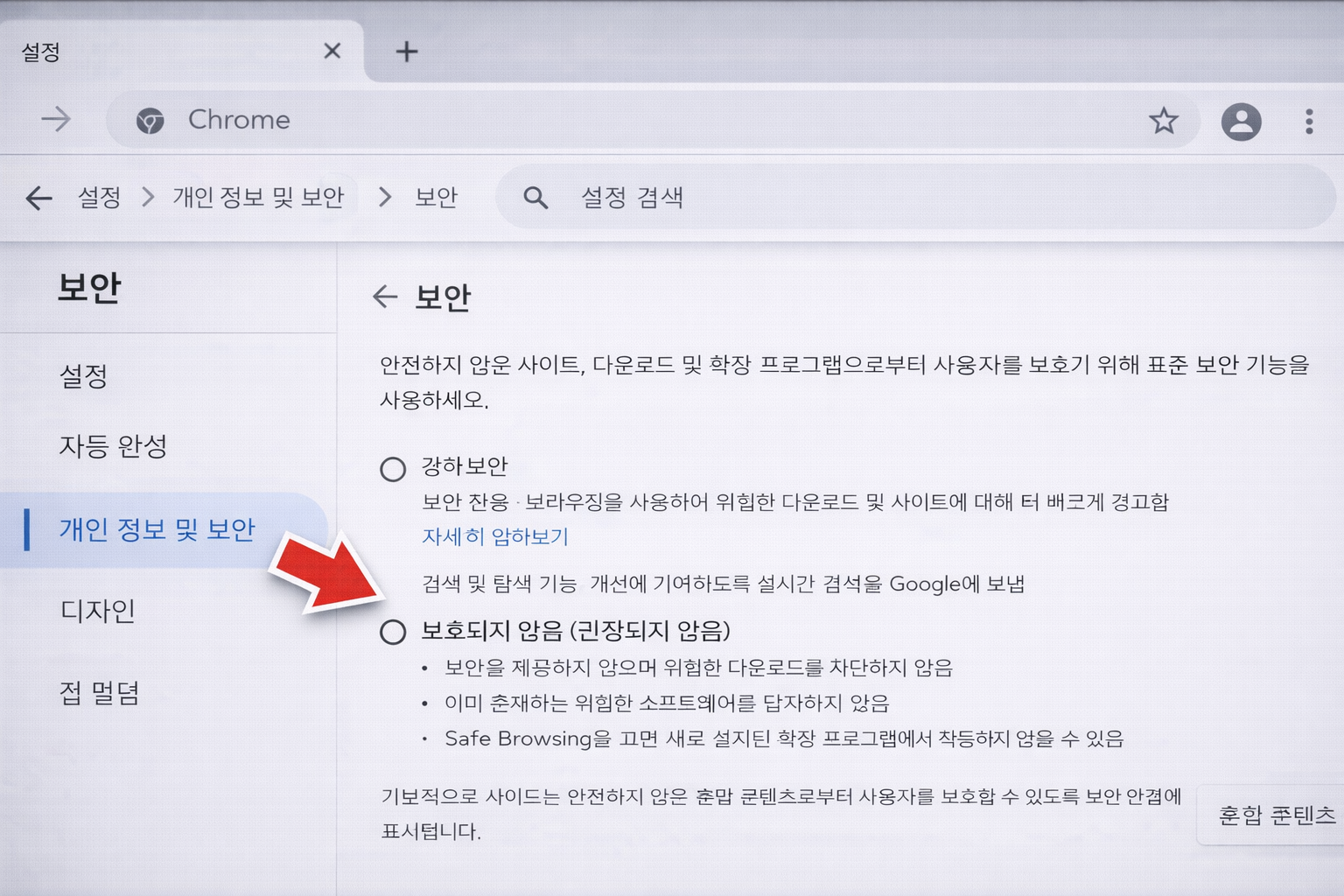 보안 메뉴에 들어가면 Chrome 보안 설정을 변경할 수 있습니다.