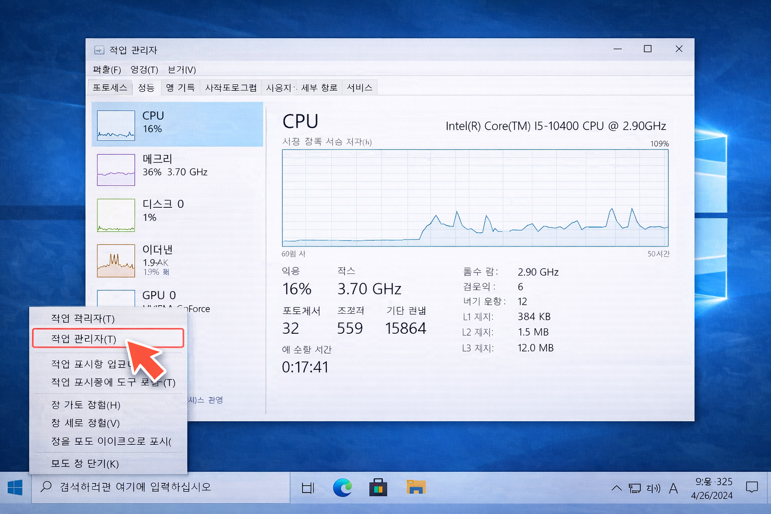 작업 관리자를 통해서도 컴퓨터 성능을 확인할 수 있습니다.