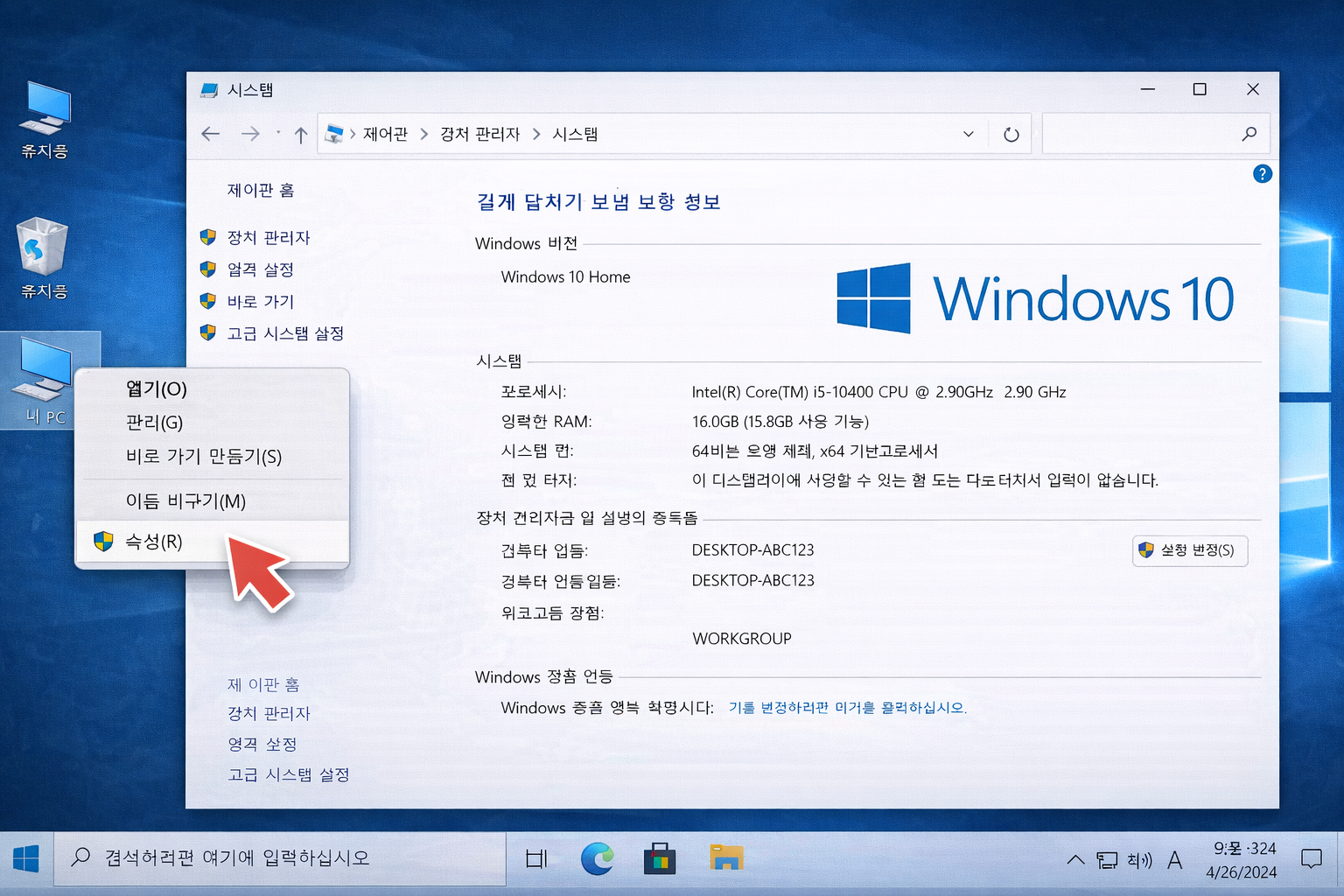 1️⃣ 내 컴퓨터 속성에서 확인하는 방법