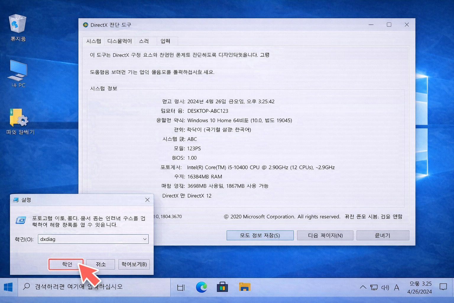 2️⃣ 실행 창에 dxdiag 입력