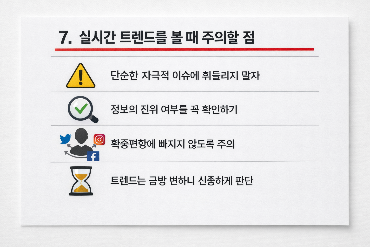 실시간 트렌드는 현재 관심 흐름을 빠르게 보여준다는 장점이 있지만, 그대로만 받아들이기보다는 한 번 더 맥락을 보는 것이 중요합니다.