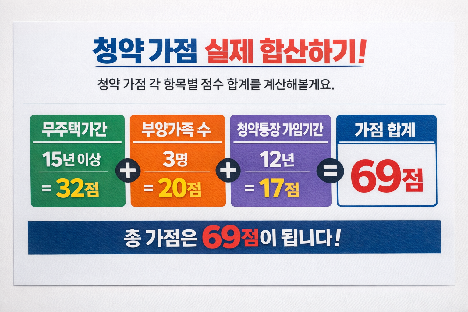 즉, 무작정 “청약통장을 오래 들고 있었으니 유리하겠지”라고 생각하기보다는 세 항목을 각각 따로 계산해보는 습관이 중요합니다. 실제로는 통장 가입기간보다 부양가족 수와 무주택기간에서 점수 차이가 더 크게 벌어지는 경우가 많습니다. :contentReference[oaicite:2]{index=2}