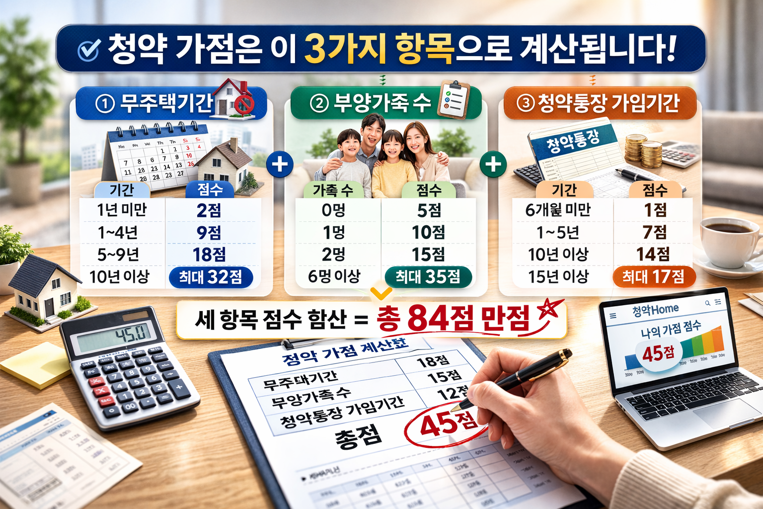 특히 민영주택 일반공급에서는 가점이 당첨 가능성을 크게 좌우하는 경우가 많아서, 무주택기간, 부양가족 수, 청약통장 가입기간을 정확히 이해하고 있어야 불필요한 실수도 줄이고 전략도 세우기 쉬워집니다. 청약 가점은 총 84점 만점으로 운영되며, 무주택기간 최대 32점, 부양가족 수 최대 35점, 청약통장 가입기간 최대 17점으로 구성됩니다. :contentReference[oaicite:0]{index=0}